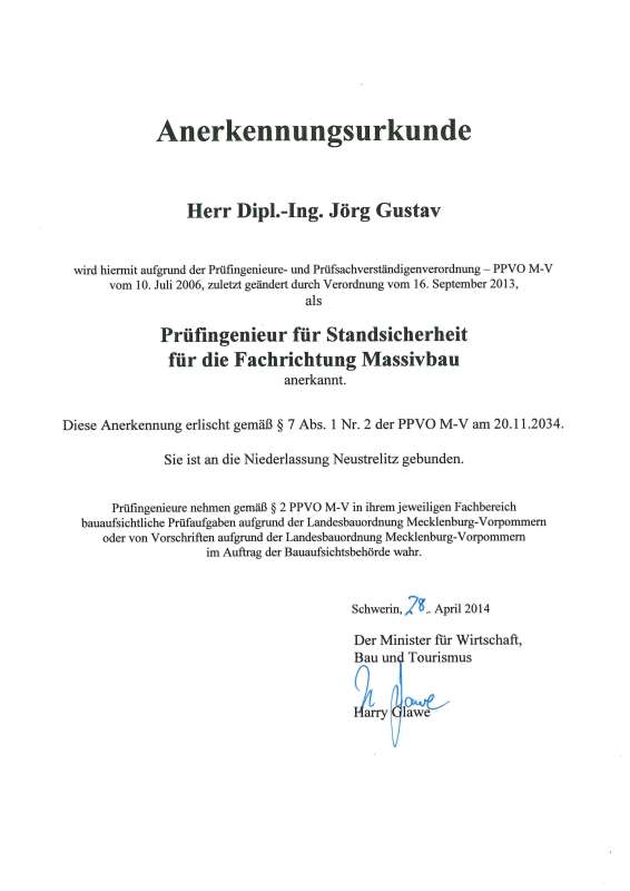 Im April 2014 erhielt Dipl.-Ing. Jörg Gustav die Anerkennung des Ministeriums für Wirtschaft, Bau und Tourismus Mecklenburg-Vorpommern als Prüfingenieur für Standsicherheit für die Fachrichtung Massivbau. Die Anerkennung basiert auf der Prüfingenieure- und Prüfsachverständigenverordnung (PPVO M-V) vom 10. Juli 2006, zuletzt geändert durch Verordnung vom 16. September 2013.